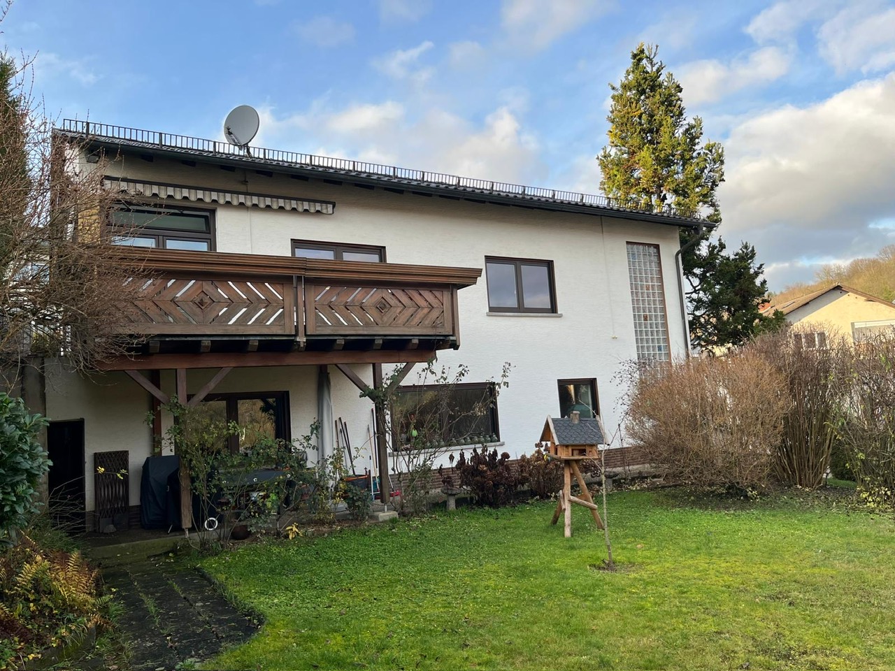 Freistehendes Wohnhaus mit zwei Wohnungen, Bj. 1967, Hangbauweise, zur Straße 1-geschossig, zum Garten 2-geschossig, ebenerdiger Zugang, voll unterkellert (teilweise ausgebaut, weiterer Ausbau vorstellbar), Satteldach (ausgebaut), bauzeitgemäße Bausubstanz, begonnene und größtenteils durchgeführte Modernisierung der Ausstattung